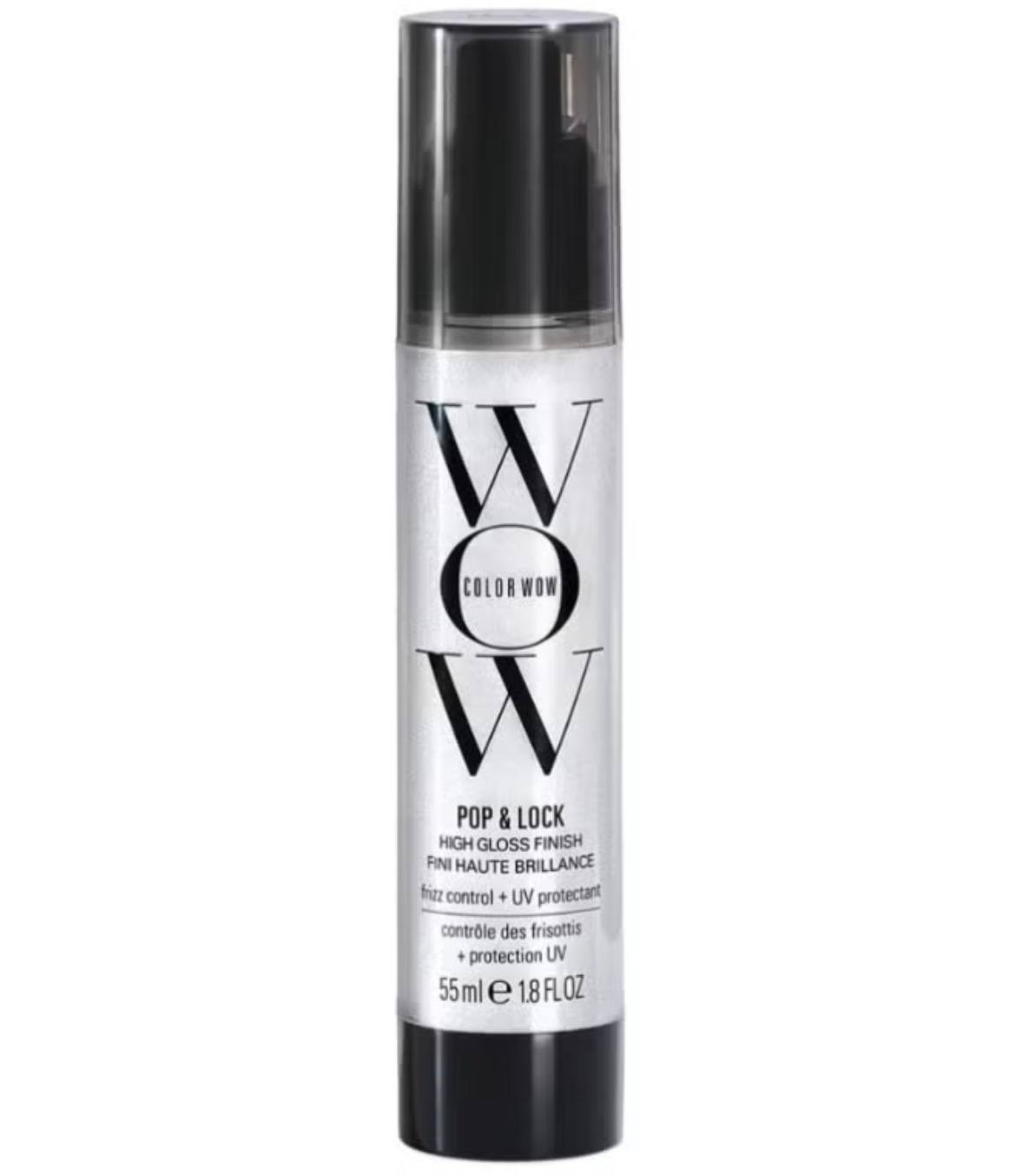 Achieve a high-gloss finish with the color wow pop + lock frizz control + glossing serum. This anti-frizz serum combines the conditioning benefits of an oil with the shine of a serum, providing UV and heat protection while temporarily sealing split ends and preventing color fade.