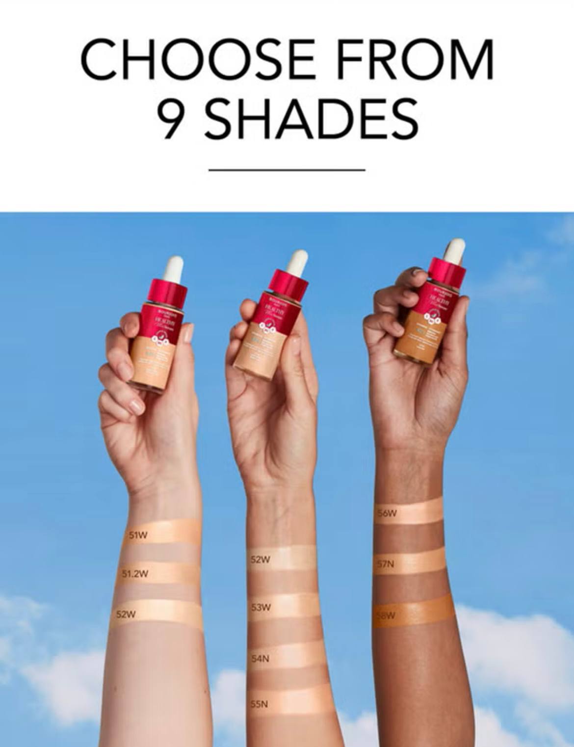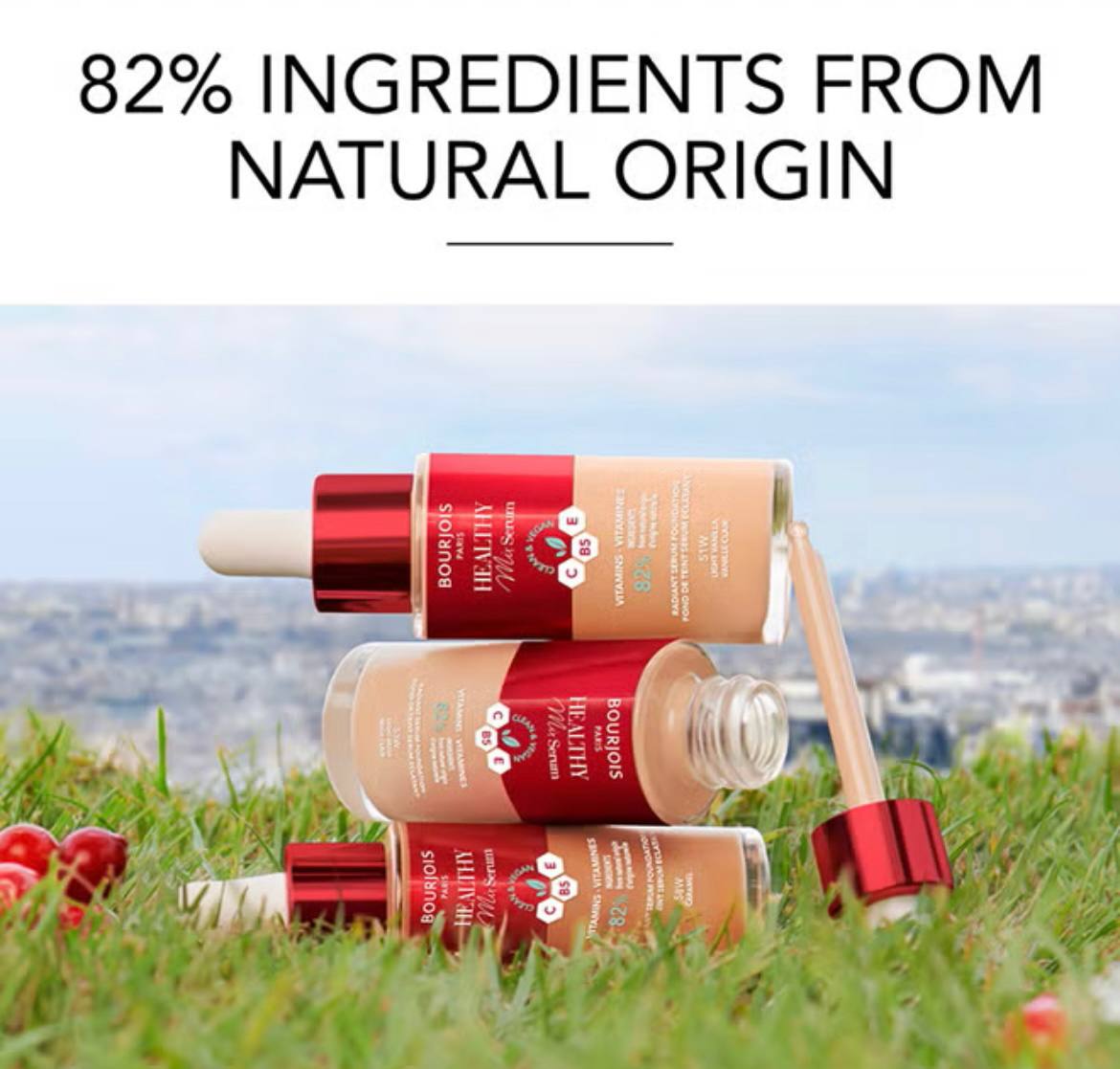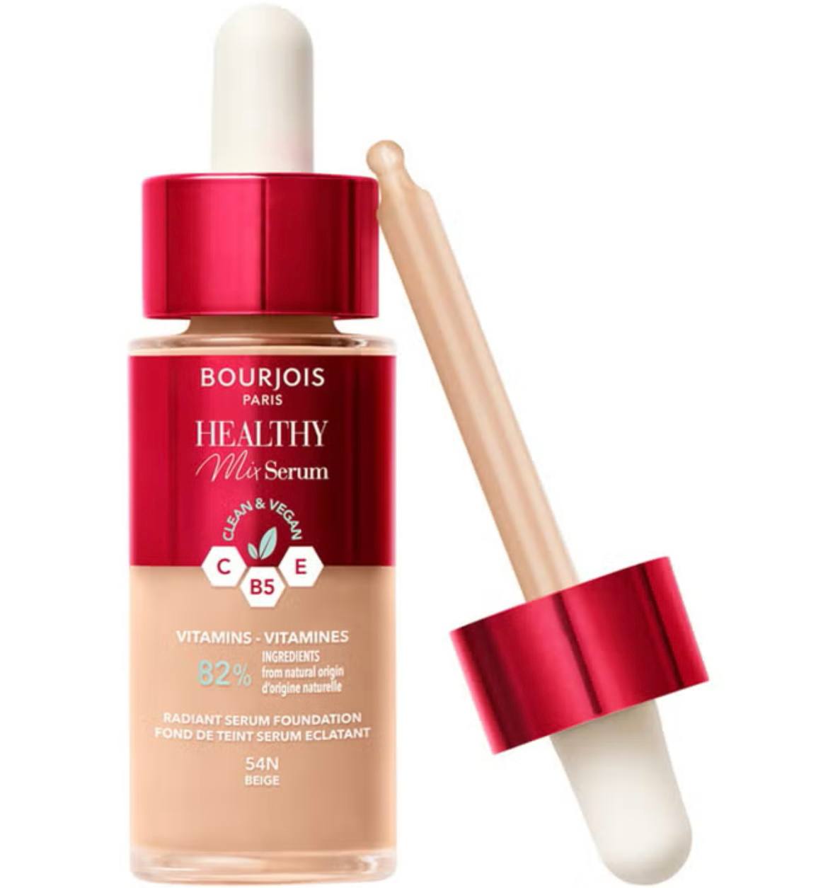 • The Parisian secret to healthy-looking skin? A few tinted drops of Bourjois Healthy Mix Serum Foundation! Inspired by healthy skincare rituals, it combines the power of a silky-textured face serum with the excellent coverage of a foundation that easily blends to make your skin 50% more hydrated after 6 hours and radiant all day long• This vegan foundation is infused with natural, skin-loving ingredients, such as Vitamins C, E, and B5 that help strengthen the skin’s barrier, and cranberry extract – a natural peptide known for its anti-aging properties• Find your foundation match from a palette of 9 skin-matching shades, ranging from Light Vanilla #51 to Caramel #58. This Bourjois foundation is buildable and provides light to medium coverage that evens skin tone and covers imperfections. It’s non-greasy and non-creasing; 93%* of women agreed it feels ultra-comfortable on the skin all day• Bourjois is the iconic French beauty brand defined by a joyful spirit that celebrates all of the carefree, happy and blissful moments that are part of life. And for a healthy life, you need a beautiful mix. A balance of nature and cities. Of sunny days and fun-filled nights. Time alone and partying with friends. What you need – and what you want. Beauty is in the mix• Each Healthy Mix product is clean, defined as a formula that is good for the skin, vegan, free of animal-derived ingredients or animal by-products, and includes ingredients of natural origin. All product packaging includes post-consumer recycled content