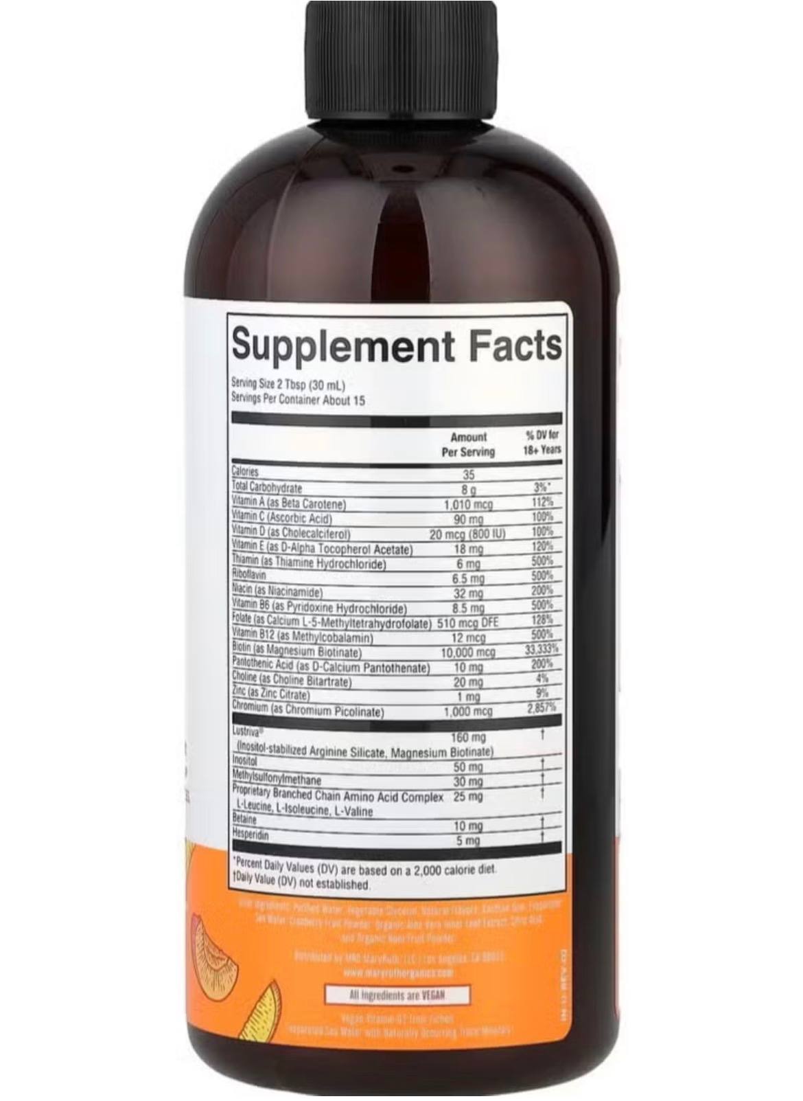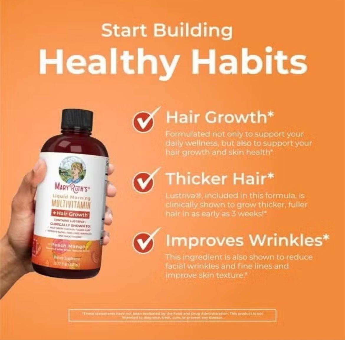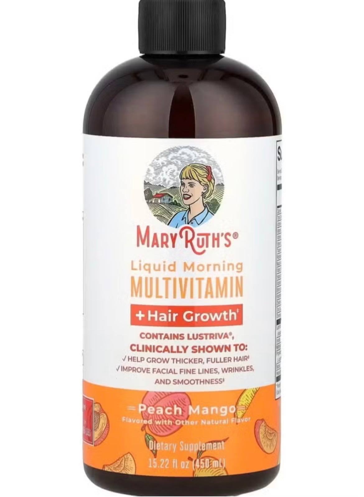 We’ve formulated a hair vitamin not only to support your daily wellness but also to support your hair growth and skin health. Lustriva, included in this formula, is clinically shown to grow thicker, fuller hair in as early as 3 weeks! Lustriva is also shown to reduce facial wrinkles and fine lines and improve skin texture. This liquid multivitamin includes all eight B vitamins, including 10,000 mcg biotin magnesium biotinate, a unique form of biotin that is 40x more soluble than D-biotin — as well as folate as calcium L-5-methyltetrahydrofolate! B vitamins are essential to support vital functions like skin health, energy levels, metabolism, circulatory health, DNA/RNA synthesis, neurochemical production, immune health, and more. Also included are vitamin D, vitamin C, biotin 10000mcg, chromium picolinate, methylated folate, and other vitamins for hair growth. This multivitamin for women is a part of TikTok trend items! Hair growth supplements for hair growth! MARY RUTH MULTIVITAMIN HAIR GROWTH hair vitamin hair vitamins hair supplements for hair growth hair growth vitamins vitaminas para el cabello hair loss treatments for women hair thickening products for women hair vitamins for women hair regrowth treatment for women Ingredients: Purified Water, Vegetable Glycerin, Natural Flavors, Xanthan Gum, Evaporated Sea Water, Cranberry Fruit Powder, Organic Aloe Vera Inner Leaf Extra, Citric Acid, Potassium Sorbate, Organic Noni Fruit Powder HAIR GROWTH PRODUCT: We’ve formulated a multivitamin not only to support your daily wellness but also to support your hair growth and skin health. Lustriva, included in this formula, is clinically proven for hair growth by increasing hair thickness in women in as early as 3 weeks! BIOTIN 10000MCG: This liquid multivitamin includes all eight B vitamins, including 10,000 mcg biotin magnesium biotinate for hair growth, a unique form of biotin that is 40x more soluble than D-biotin — as well as methylated folate as calcium L-5-methyltetrahydrofolate! HAIR THICKENING PRODUCTS FOR WOMEN: This new formula of our original, best selling & TikTok trending liquid multi now has Lustriva for hair growth and B vitamins for skin health! With nutrients for immune support and overall wellness, this multivitamin for women comes in a delicious peach mango flavor.